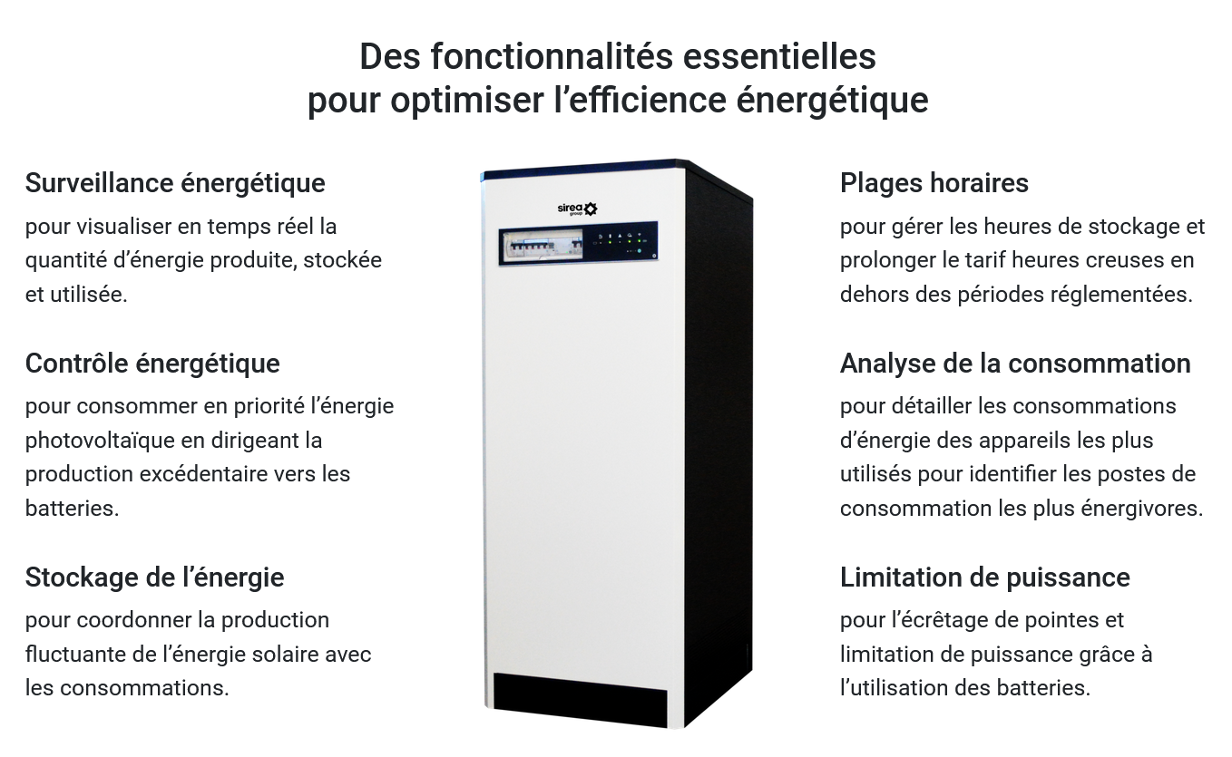 SIREA, conçoit et propose une gamme d’armoires d’autoconsommation disponibles en plusieurs puissances et capacités de stockage.
